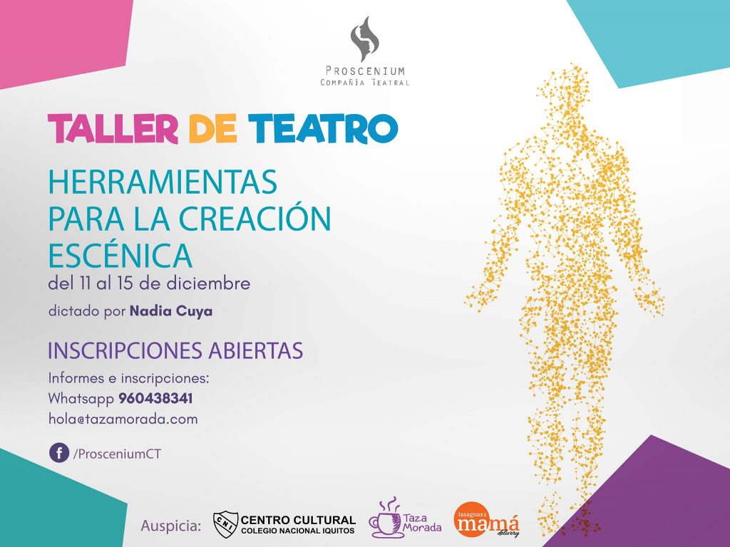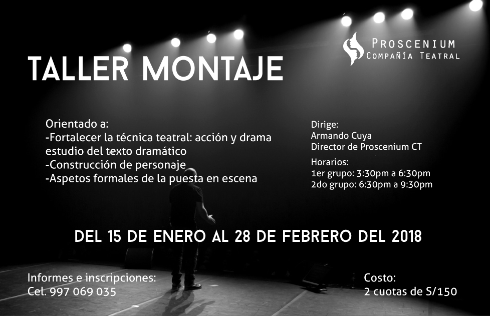 En el año 2016, decidimos incorporar a nuestras producciones, obras dirigidas al público joven y adulto, nace de esta manera Proscenium Compañía Teatral, que busca generar un acercamiento y formación de públicos hacia el consumo artístico teatral, la producción teatral de obras del ámbito local, regional, nacional y universal, la capacitación y fortalecimiento de capacidades técnica teatral, dirigido a actores amateur jóvenes y adultos, que comparten su interés hacia el teatro con otras carreras profesionales y la investigación teatral. A la fecha se han desarrollado los talleres “Herramientas para la creación Escénica I y II”, un Taller de Montaje Teatral 2018 y Taller laboratorio 2020.